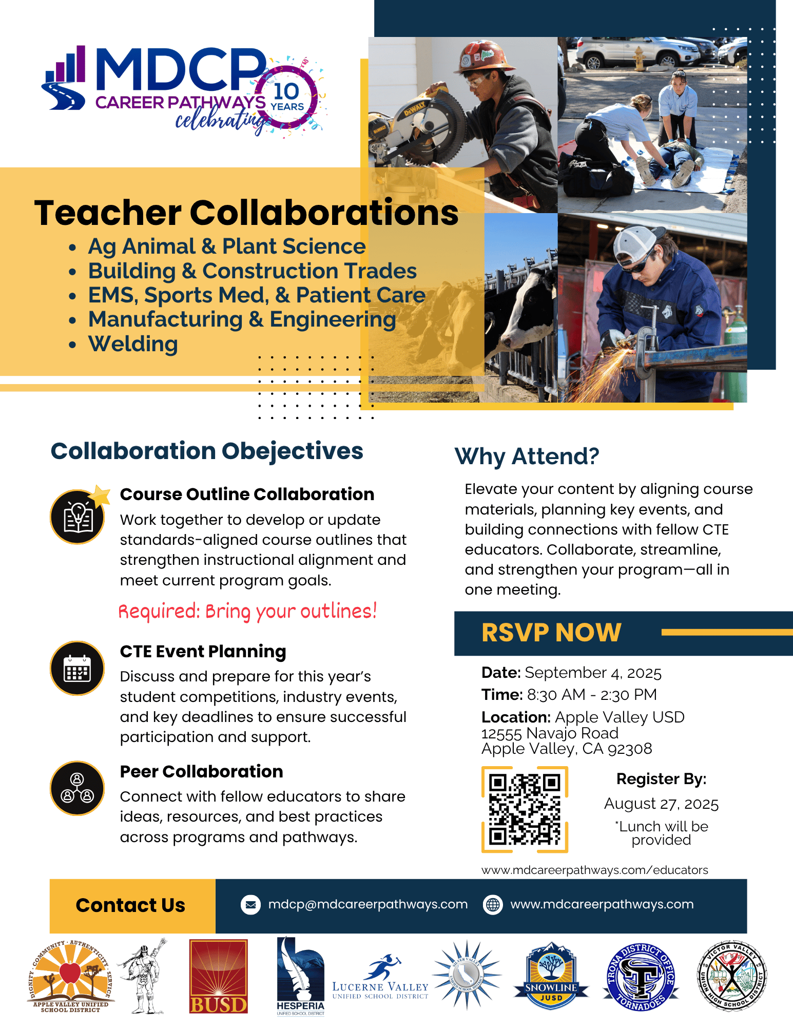 Join us for MDCP’s Teacher Collaboration on September 4, 2025, where CTE educators in Ag Science, Construction, Healthcare, Manufacturing, and Welding will come together for a focused session of collaboration. All participating teachers must bring their current standards-aligned course outline drafts—whether complete or just starting—as well a laptop and any supplementary materials (e.g. textbooks, digital curriculum) they’ll need to revise or develop their outlines. Sector-specific groups will work together to strengthen instructional alignment and program quality.