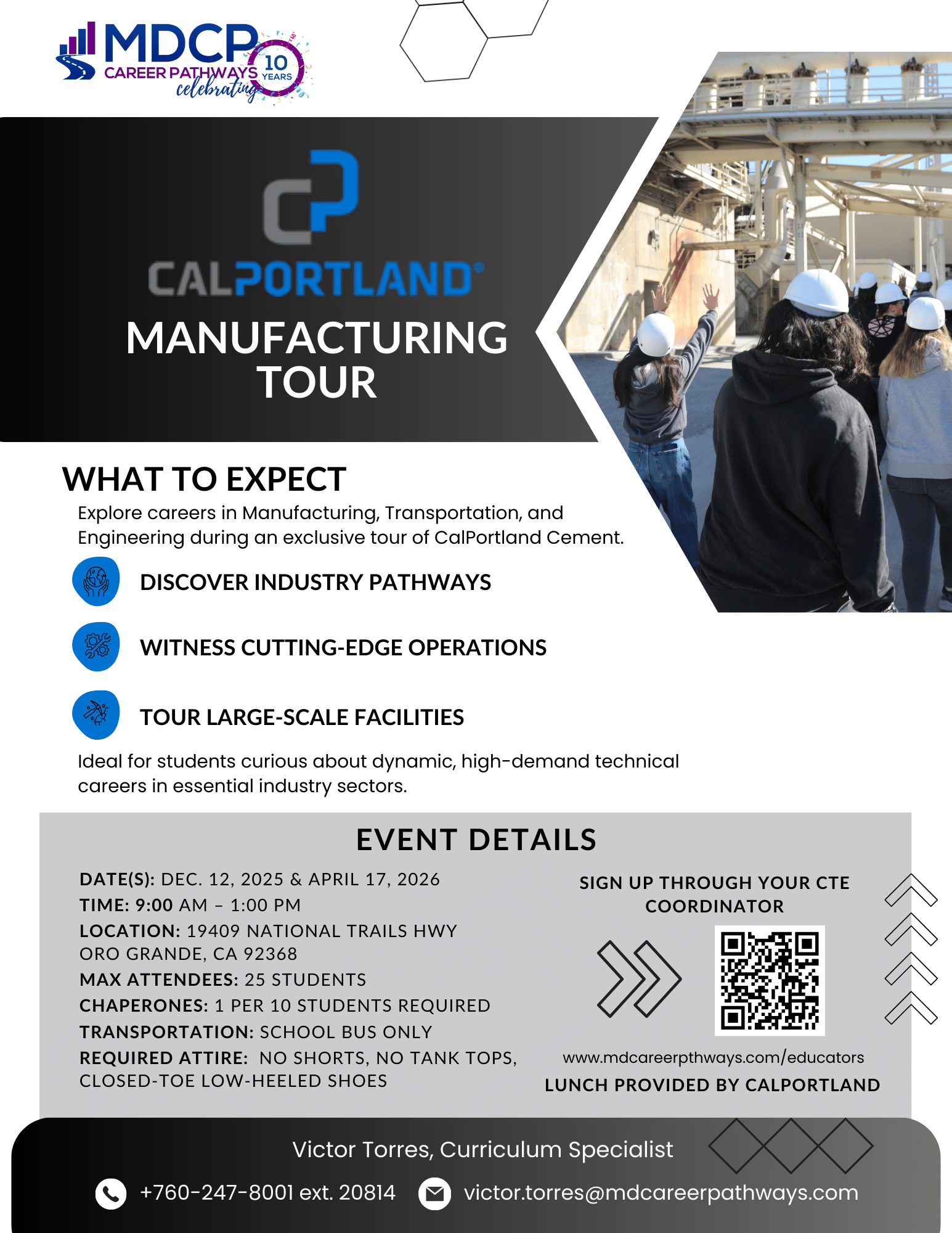 Explore real-world careers in Manufacturing, Transportation, and Engineering during an exclusive behind-the-scenes tour of CalPortland Cement in Oro Grande, CA. Students will have the opportunity to discover industry pathways, witness cutting-edge operations, and tour large-scale facilities that drive this essential industry. If conditions allow, participants may even experience a live mine blast! This immersive experience is designed for students curious about dynamic, high-demand technical careers that support the backbone of our economy.