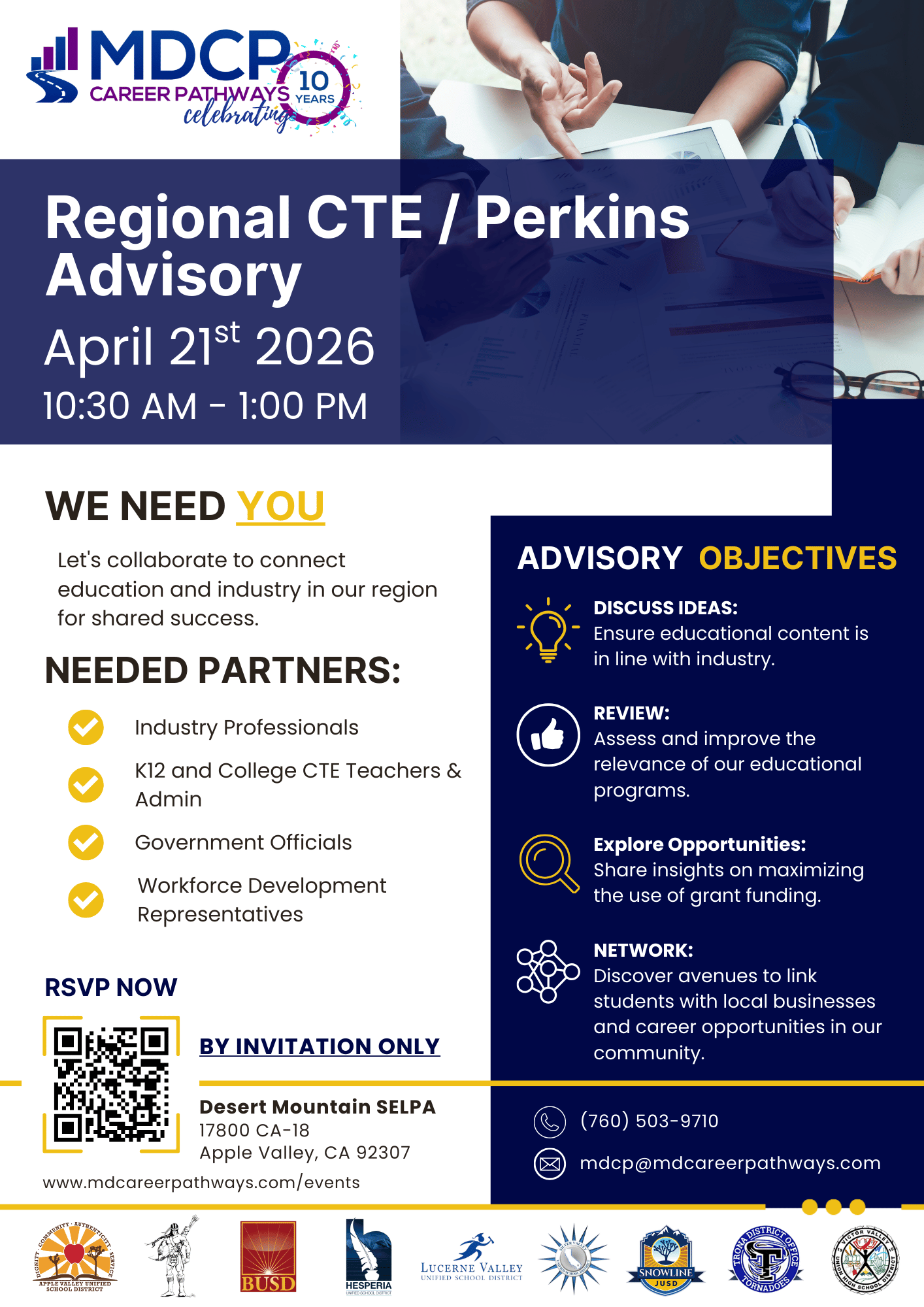 Join us for the Regional CTE / Perkins Advisory meeting on April 21, 2026. This collaborative session brings together education, industry, and community partners to strengthen connections and align efforts that support meaningful career pathways for students in our region.